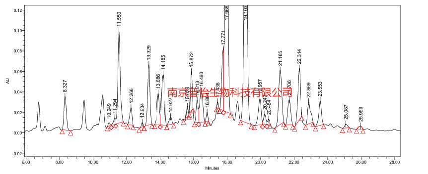 色譜圖黃酮色譜峰加以標識,共計標識出29個黃酮類色譜峰 從放大圖中可以看出,該部分仍有5個非黃酮類化合物,但從峰 面積及峰高判斷,該類化合物占比很小。